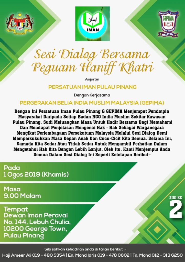 « All Events This event has passed. IMAN Peravai – Sesi Dialog Bersama Peguam Haniff Khatri August 1, 2019 @ 9:00 pm - 11:00 pm « Islamiya Kaviyarangam Sidan Media Solidarity Bersama Kashmir » Add to calendar Google Calendar iCalendar Outlook 365 Outlook Live Details Date: August 1, 2019 Time: 9:00 pm - 11:00 pm Event Category: PERMIM Events Event Tags:Sesi Dialog Organizer Persatuan Iman Pulau Pinang Venue Dewan Iman Peravai No.144 Lebuh Chulia Georgetown, Pulau Pinang 10200 Malaysia + Google Map