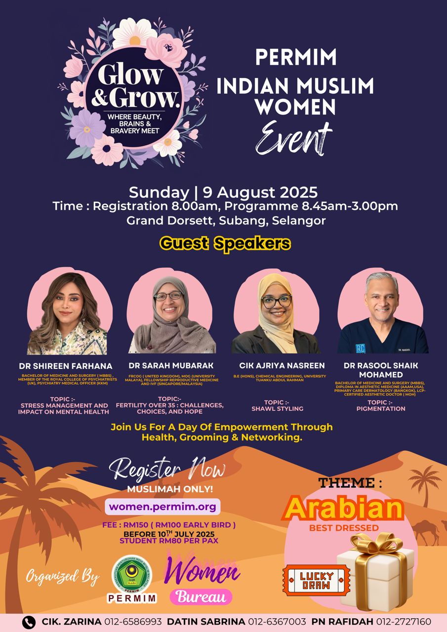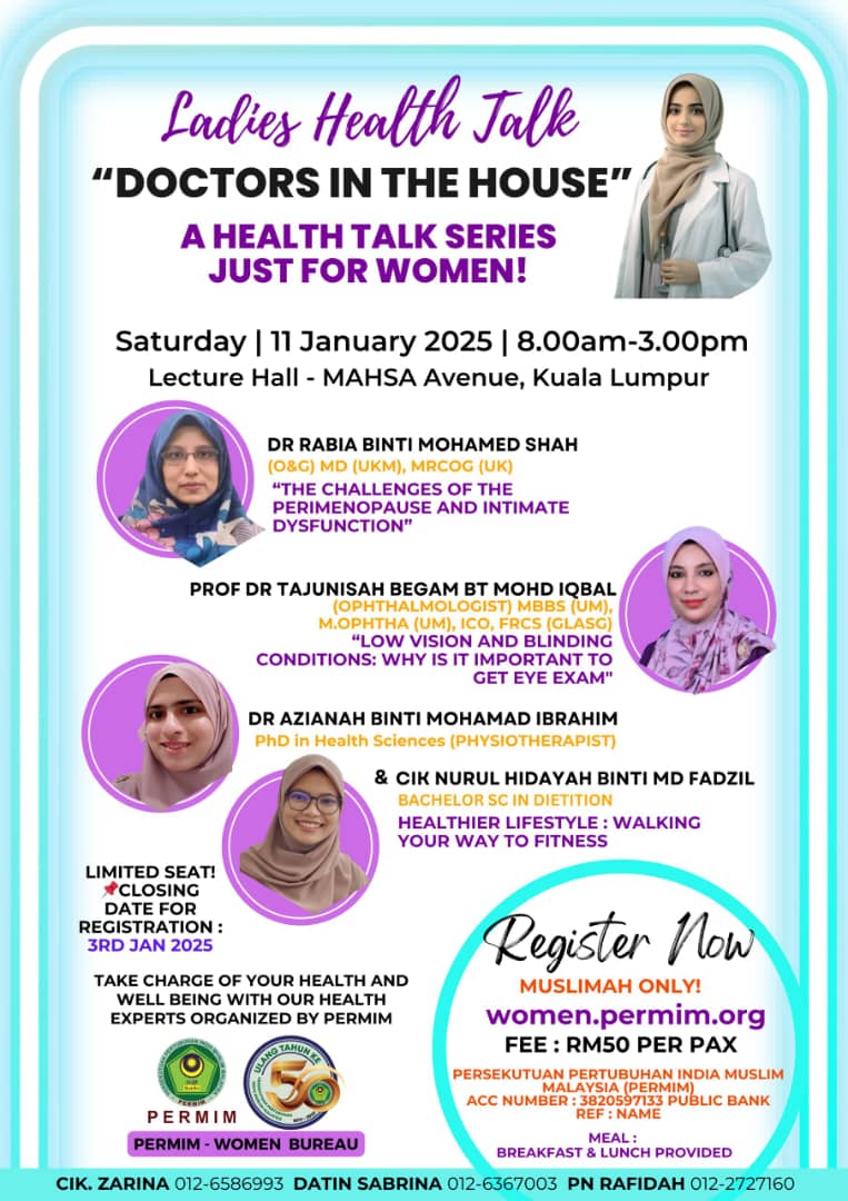 Lecture Hall - MAHSA Avenue, KL Jalan Ilmu, Kuala Lumpur🎗️ Ladies Event🎗️ - PERMIM Women Bureau Event: Ladies Health talk ! "DOCTORS IN THE HOUSE" 🧕🏻🧕🏻🧕🏻 Date : 11.01.2025 (Sat) Time: 8am to 3pm Venue: Lecture Hall - MAHSA Avenue, KL Fees : RM50/pax Target Audience : MUSLIMAH Only (Age 20 above) Fees Payable to : Account Name : PERSEKUTUAN PERTUBUHAN INDIA MUSLIM MALAYSIA(PERMIM) … Continue reading Ladies Health talk ! “DOCTORS IN THE HOUSE”